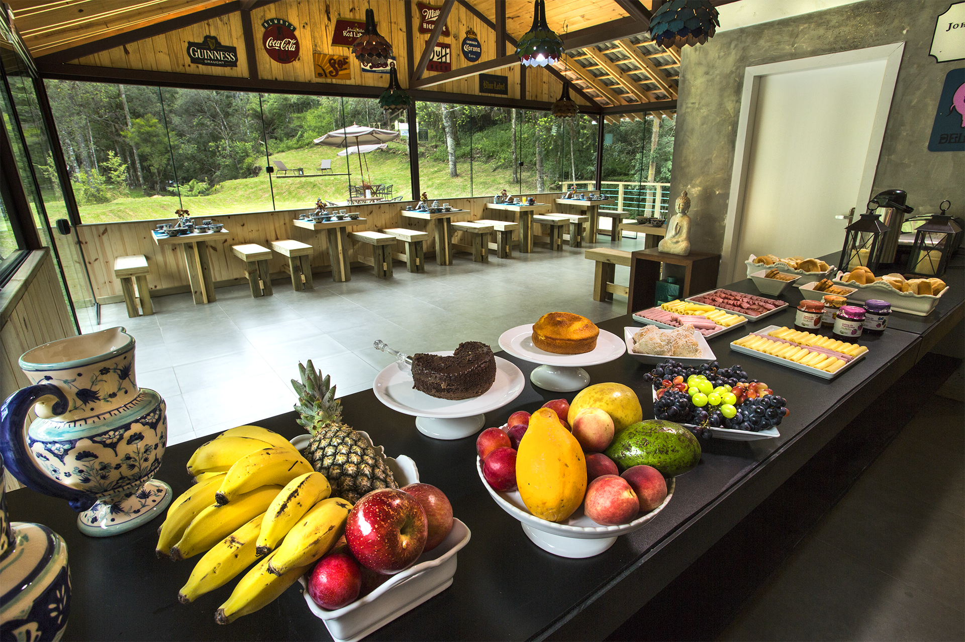 En nuestro espacio "desayuno", Creamos un ambiente que se ajusta al concepto de estar en contacto permanente con la naturaleza y, tan, Su construcción sigue el patrón de la armonía entre el vidrio y madera intrincado, permitiendo de nuevo que nuestros huéspedes disfrutan de hermosas vistas del bosque de Araucaria y Río de Capoeira “serpenteia” propiedad.